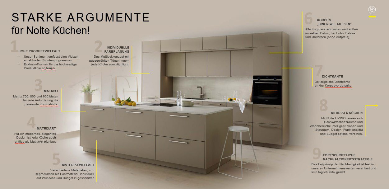 Mit dem Anspruch, es immer noch ein bisschen besser zu machen, entstehen bei Nolte Küchen hochwertige Lösungen für den individuellen Küchentraum. Mit einer präzisen Materialverarbeitung, innovativen Ideen, einem stilvollen Design und Qualität „Made in Germany“ überzeugen die Küchen seit mehr als 60 Jahren.